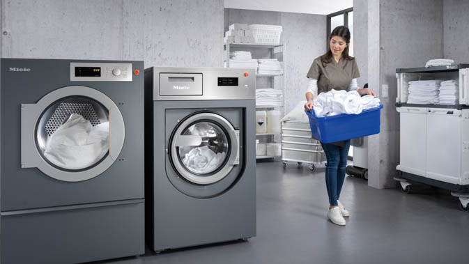 Kurze Laufzeiten, automatische Erkennung des Beladungsgewichts und entsprechend angepasste niedrige Verbräuche von Strom und Wasser: all das macht Wäschereimaschinen von Miele Professional im Arbeitsalltag unentbehrlich. Bis zu 90 Waschprogramme, die in zielgruppengerechten Paketen zusammengefasst sind, passen sich dem individuellen Bedarf an. Ein Paket für Hotels, Restaurants und Catering enthält zum Beispiel Spezialprogramme für Bett- und Frotteewäsche, Matratzenschonbezüge, Bademäntel, Küchen- und Tischwäsche. Geht es um Textilien für Senioreneinrichtungen, kommen auch Spezialprogramme für die RKI-konforme Desinfektion von Wäsche zum Einsatz. Für Gebäudereiniger wiederum sind patentierte Programme für die Aufbereitung von Mopps und Wischtüchern hilfreich, professionelle Reinigungen dagegen nutzen häufig das System „WetCare“ für Textilien, die als „nicht waschbar“ gekennzeichnet sind.
